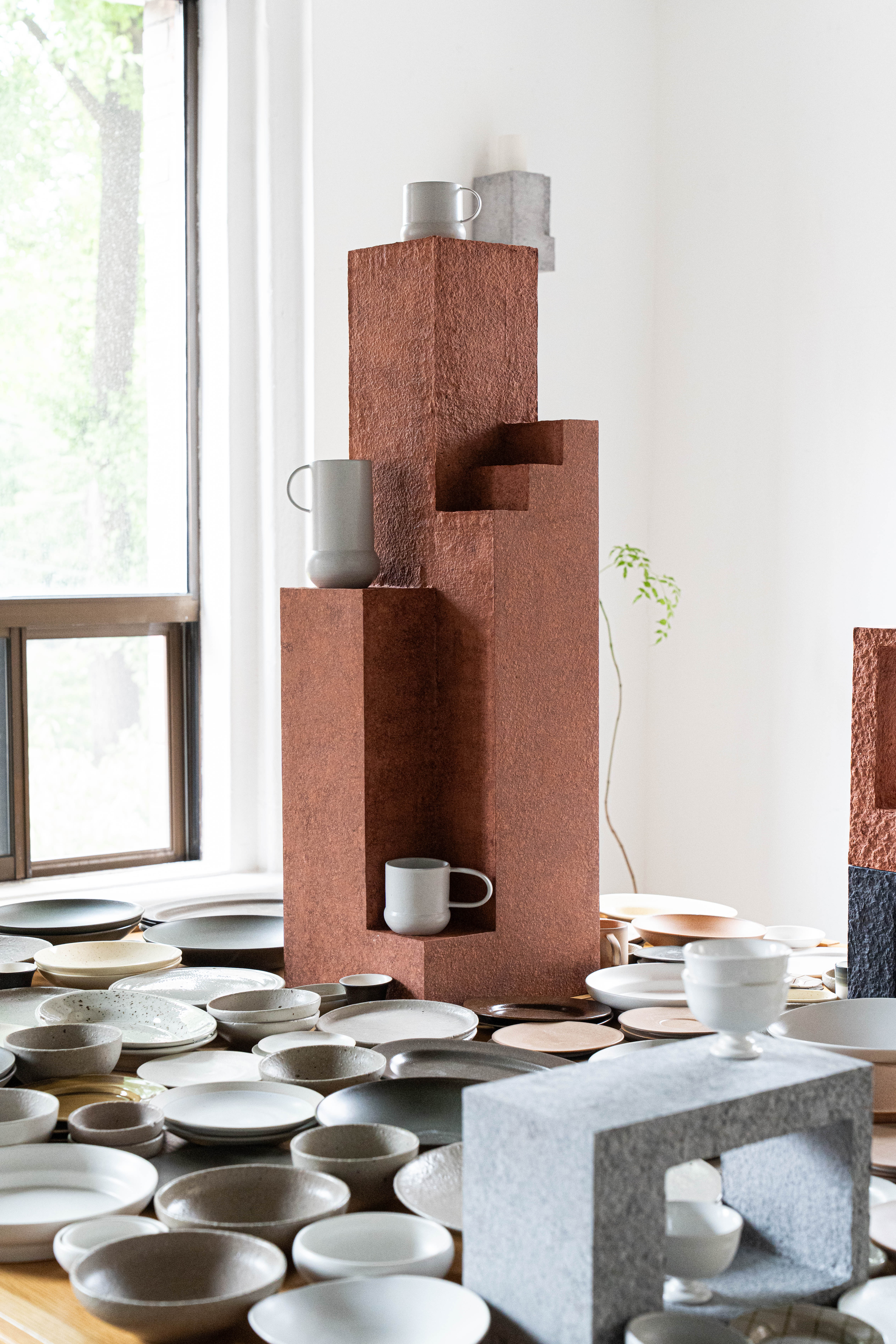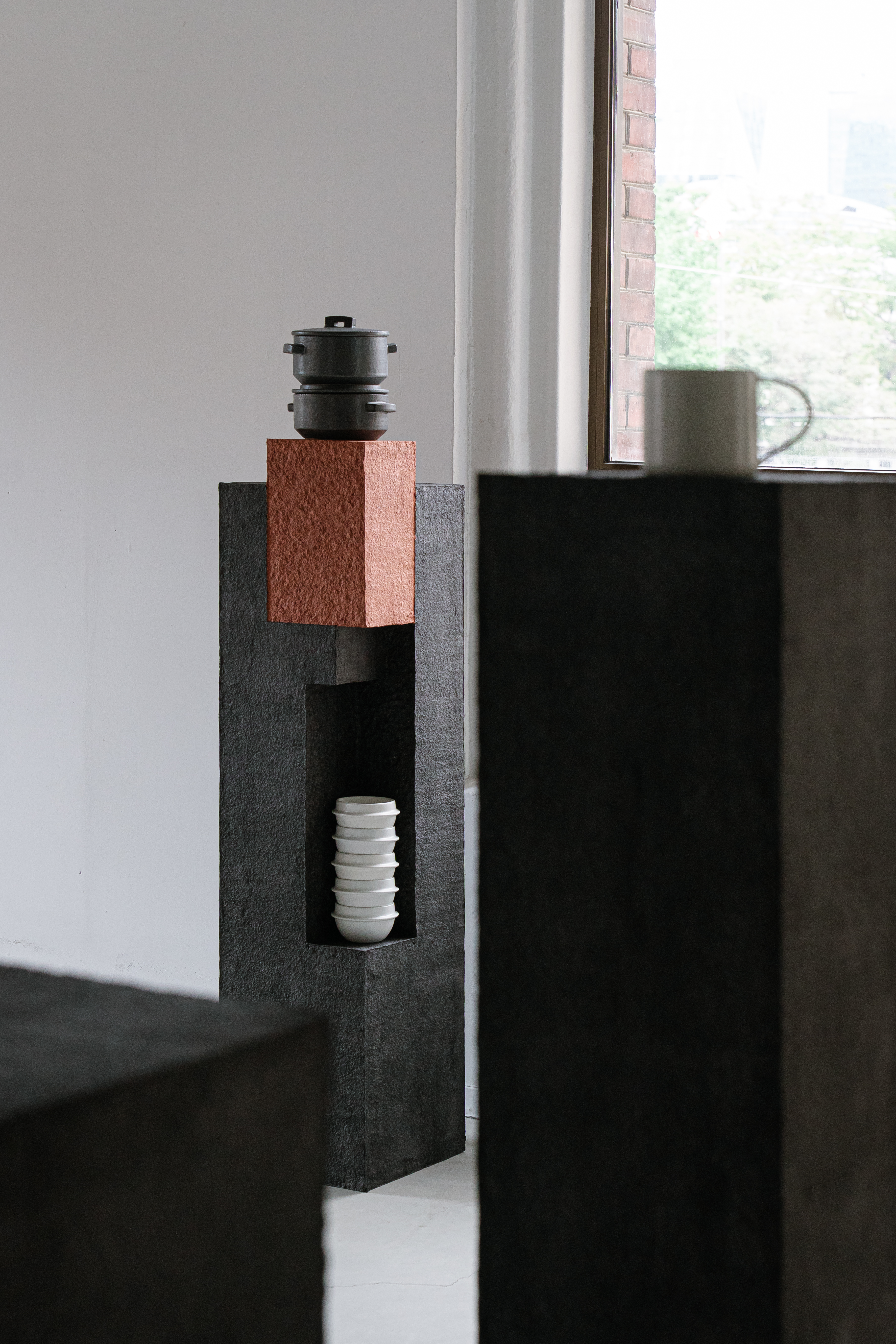 이번 전시는 사물, 공간, 그리고 인간이 뒤얽혀 만들어내는 하나의 연극입니다. 이우재는 무언가를 올려놓기 위한 부차적 사물로 인식되던 선반을 공간의 분위기를 형성하는 주체적 무대로 재해석합니다. 전시 장소이자 약 100년의 시간을 품은 근대문화유산인 소일베이커 정동은 극장이 되고, 그 건축 요소는 이우재 작품의 색과 구조로 스며듭니다. 소일베이커의 테이블웨어는 배우로서 무대에 올라 장면을 연출하고 이야기를 이어갑니다.